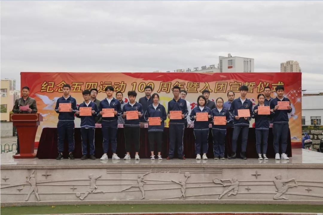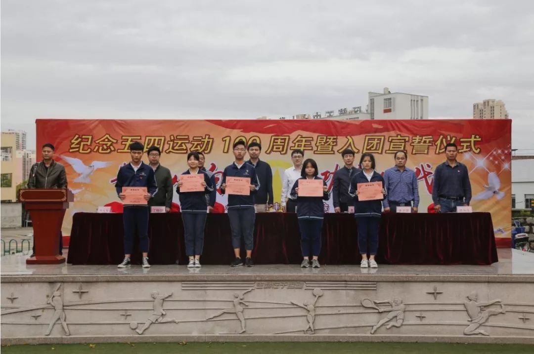 为纪念五四运动100周年,大力弘扬以爱国主义为核心的“五四”运动精神,不断增强广大青少年的“四个自信”, 加强青年团员学生的思想政治教育,引导激励学校广大师生继承“五四”运动的光荣传统,进一步增强责任感和使命感。5月6日下午,由共青团丰泽区委会主办,泉州工商旅游学校承办的“青春心向党·建功新时代”纪念五四运动100周年暨入团宣誓仪式在泉州工商旅游学校田径场举办。丰泽区团委书记詹燚、泉州工商旅游学校校长骆志忠、党支部书记吴辉强、副校长吴锡平、分管德育副校长林文亮、校长助理丁晓强、政教处主任骆子镇、校团委书记陈加志等领导和全校1200多名师生参加本次活动。