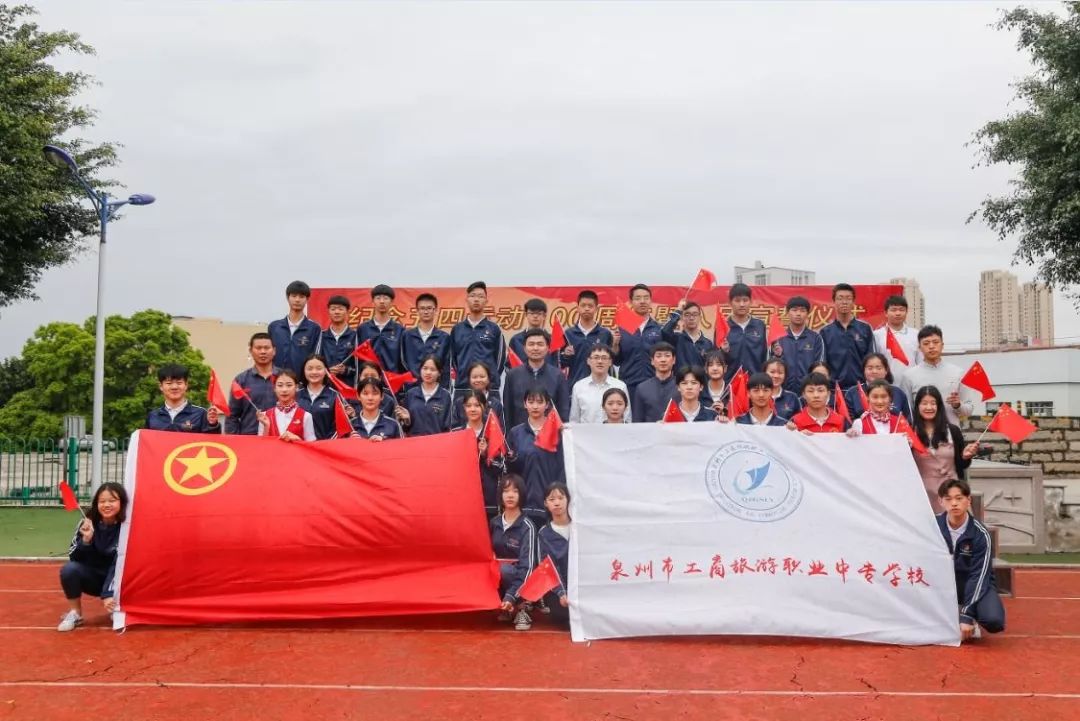 詹燚书记为本校“五四”青年志愿者团队授旗。泉州工商旅游学校“五四”青年志愿者队是一支以弘扬五四爱国精神,争做四有青年,服务社会,争做时代青年先锋为目标的志愿者团队。
