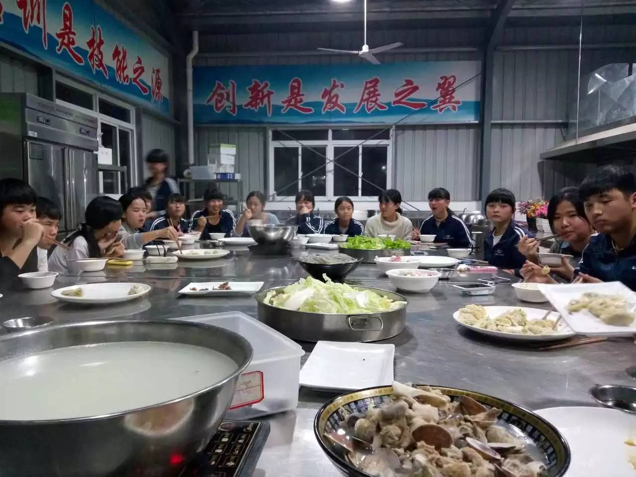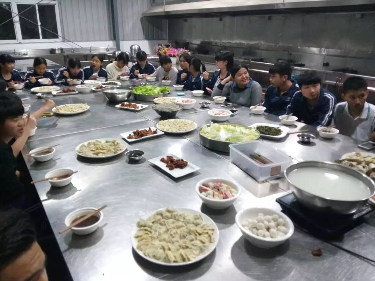 终于!!!丰盛的美食上桌了!大骨熬成的高汤沸腾着,火锅底料和食材掉入锅中,在香浓的高汤中翻滚;刚从蒸炉中取出的饺子三两下就被抢光,同学们纷纷找着自己包的饺子,迫不及待想品尝一下自己的手艺!真的是棒棒哒!(*/ω\*)