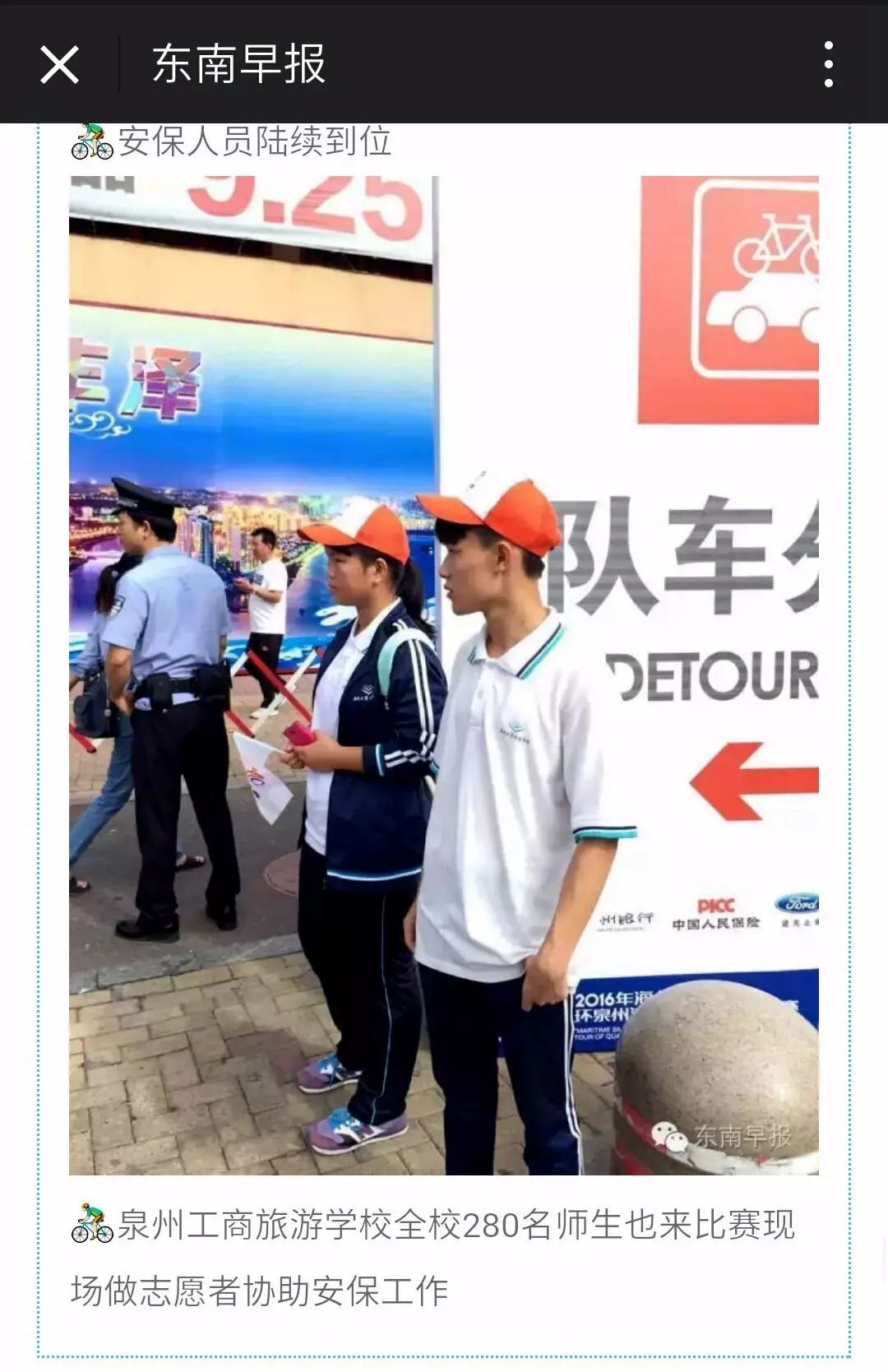 10月15日和16日,2016年海上丝绸之路环泉州湾国际公路自行车赛(以下简称环湾赛)分别进入第二个比赛日即环湾跨海赛段的争夺和最后一个赛段——城市绕圈赛段的比赛。泉州工商旅游学校280名师生志愿者奔赴赛事一线,为比赛“保驾护航”。