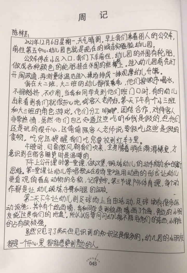 见习结束后,同学们在见习日记中写道:“两天的见习时光在7号下午回到工商落下帷幕,通过这次见习让我们清楚的认识到自己在专业知识和技能方面上的学习不足,和直观地感受到做幼儿教师并不容易,看到老师们娴熟地运用专业知识应对孩子们的各种突发状况和快速地使吵闹的孩子们安静听讲,我们深感佩服,我们应该更严格的要求自己学好专业知识和技能为今后走上幼儿教师这个岗位打好基础。”
