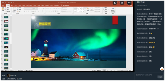第一堂成功的线上公开课,为我校线上公开课教研开新局、起好头。随后,语文组陈学慈老师也开授了第二堂线上公开课,课题为《神奇的极光》。陈学慈老师幽默风趣,课件精美,微课出彩;充分拓展思维,让学生在兴趣中学习。当堂网课点赞量达4万。