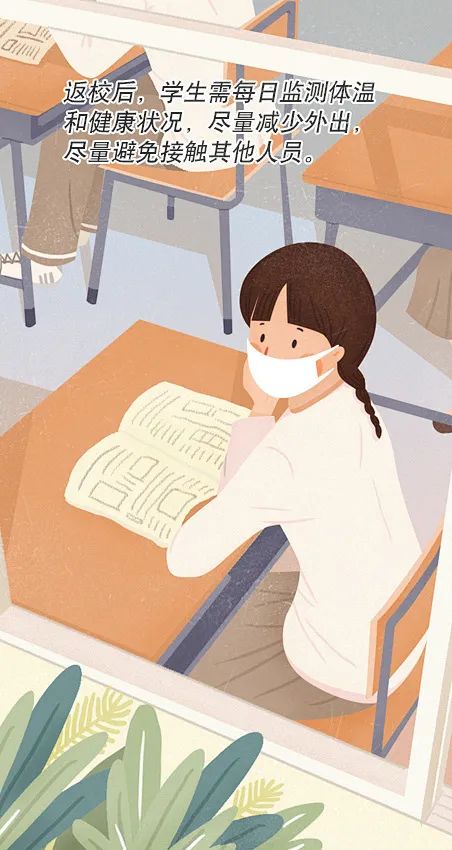 复学前,请家长根据学生自身需要,提前备好学习生活用品。上学时给学生佩戴口罩,准备适量口罩备用(进校园每天带口罩)。家长和学生要认真学习疫情防控要求,熟知学校入校测温、戴口罩、一米线、勤洗手等规定。家长接送学生要做到“两点一线”往返学校,确定一名家长实行点对点接送,即停即走,避免校门口人群聚集。不乘坐公共交通工具,上下学途中,注意做好个人防护。