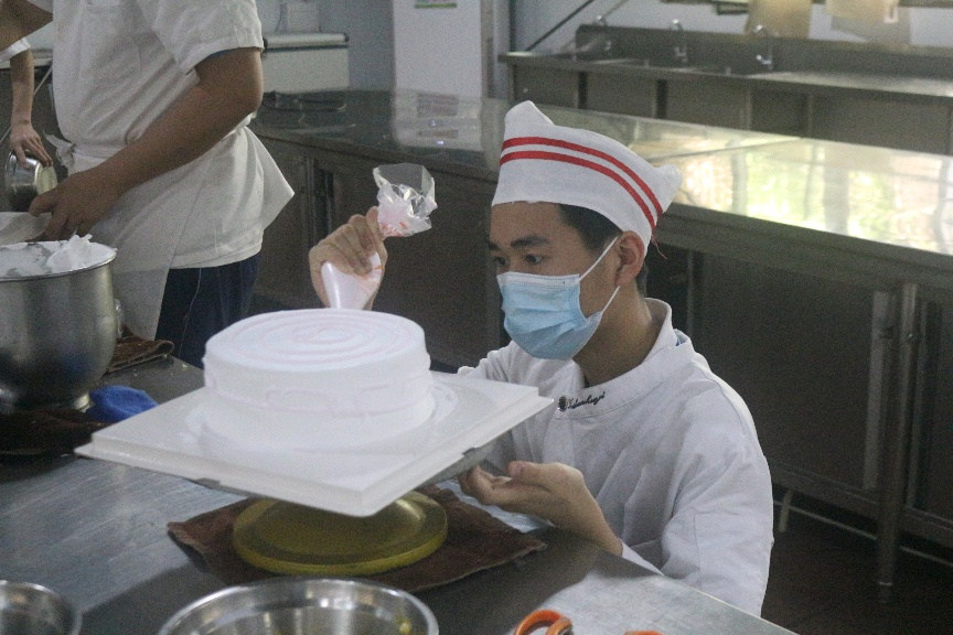 一朵朵玫瑰生动形象,洁白的抹面,加以一些装饰物,水果点饰蛋糕面,学生的创造想象力代表着各自的思想和愿望,手中的裱花袋挥舞出一道道美丽的弧线,手中的似乎不是奶油,是学子们对美好生活的向往。