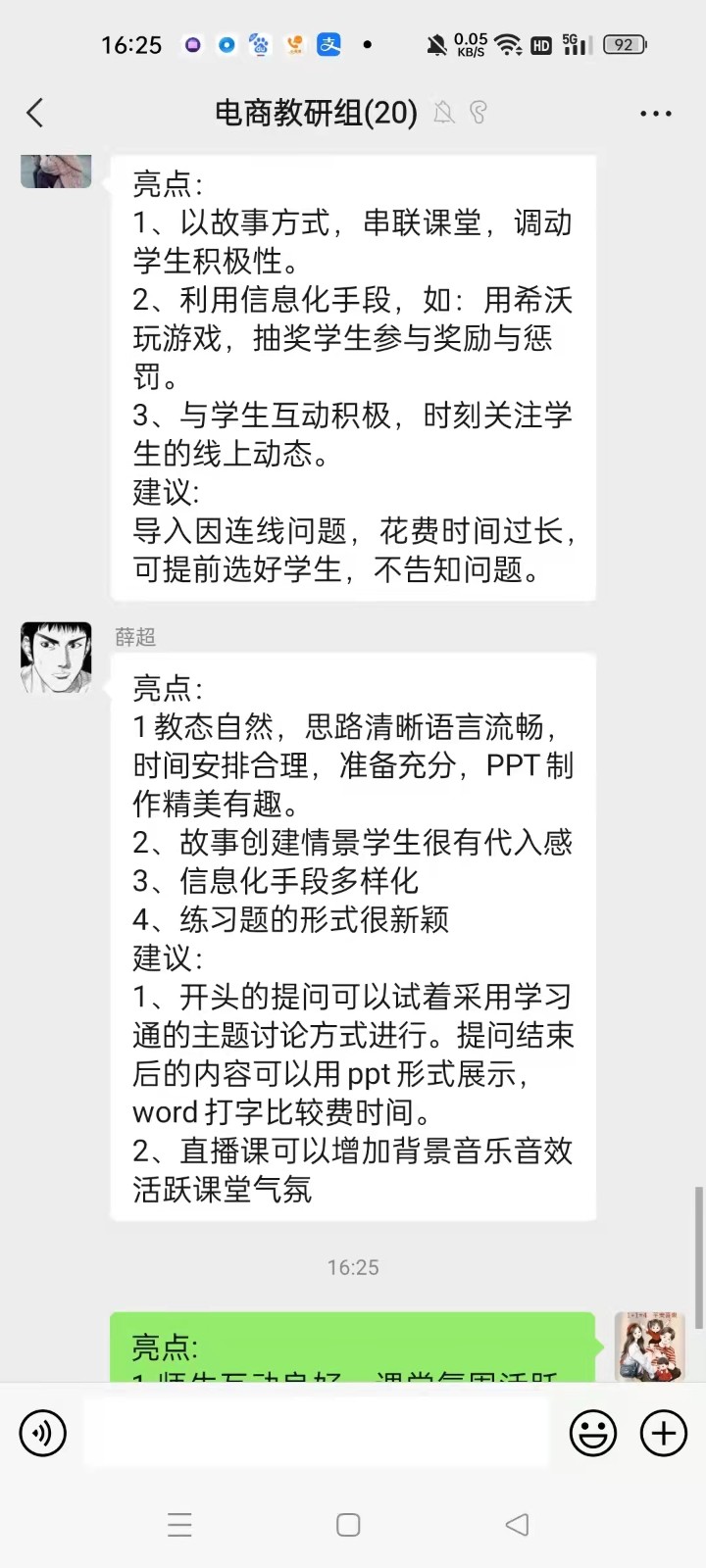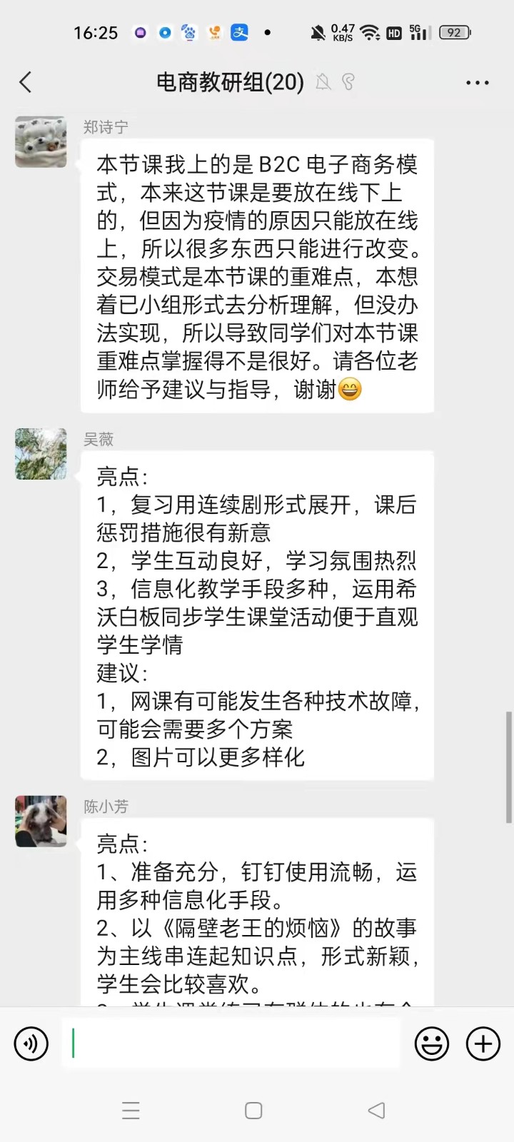 二是极其关注学生。教师们注意到线下的“观”是全方位的,双向的,而线上教学中“观”的内容迅速窄化,学生的“观”只剩下屏幕上的课件和教师的演示,教师的“观”只剩留言区的反馈,线上的“观”是局部、单向的。线上教学中教师听不见学生存在疑惑的语气词,听不见学生下意识提出的问题,会影响教师对课堂的判断。老师对着电脑说话,常常容易忽略学生的听,讲着讲着语速就快了,存在教师单向主观教学。课堂教学中老师会关注学生的看、听、行为等来判断学生的思考和接受情况,线上教学无法满足这种直观教学需要,老师们积极从学生的“看、听和回答”中关注学生、积极反馈调整教学。