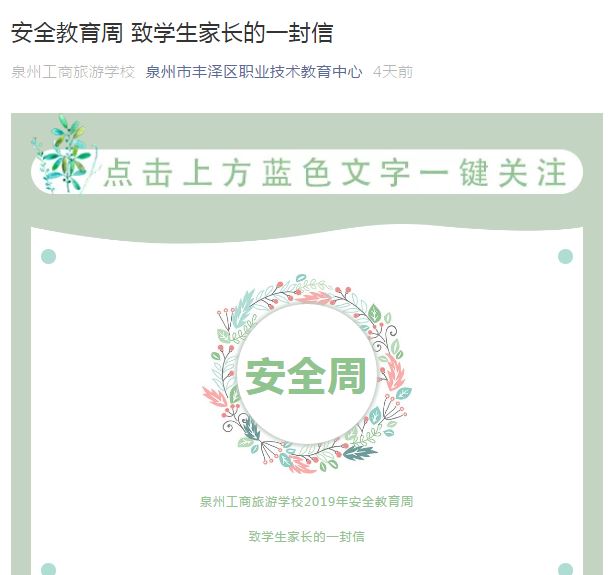 为深入贯彻落实2019年3月25日第24个“全国中小学生安全教育日”和3月25日至30日第12个“福建省学校安全教育周”教育精神,进一步加强学生的安全教育工作,预防安全事故,增强广大师生的安全防范意识和自救自护能力,进一步推进学校安全文化建设,营造“人人讲安全,事事讲安全”的校园安全环境。泉州工商旅游学校于3月25日至3月30日开展以“关爱生命·快乐成长”为主题的安全教育日(周)系列教育活动,学校制定了包括“应急疏散演练”、“主题班会”、“国旗下专题讲座”、“安全教育广播”、“安全教育致家长信”、“安全教育板报”、“校园安全宣传”等七个一的详细活动方案。