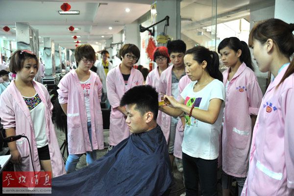 资料图片:山东蓝翔高级技工学校美容美发专业的学生在观看老师的教学示范。