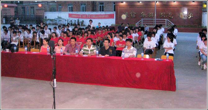 6月8日晚我校举行歌咏比赛。虽然舞台装饰不是很华丽,但同学们站在那就是一道亮丽的风景线,统一的服装、欢乐的笑容,使整个校园充满了青春活力。一首首歌曲飘扬在学校上空,有那么轻柔的《半个月亮爬上来》、有让人感动的《感恩的心》、还有令人激昂澎湃的《我的祖国》……歌声虽称不上天籁,却是那么动听,那么真切。