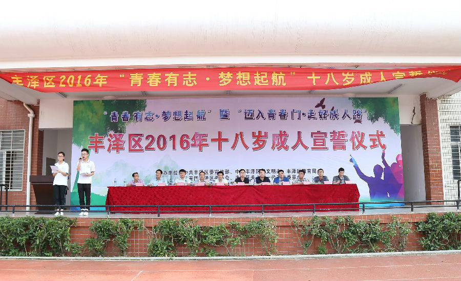 2016年5月4日下午,我校50名优秀团员和学生干部代表在学校政教处、团委会的组织下,参加了由丰泽区委宣传部、区委文明办、区教育局、团区委、区关工委等部门举办的“青春有志·梦想起航”暨“迈入青春门·走好成人路”十八岁成人宣誓仪式活动。