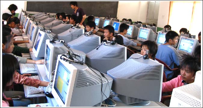 周末没有回家的部分住宿生早早进入新机房上网……