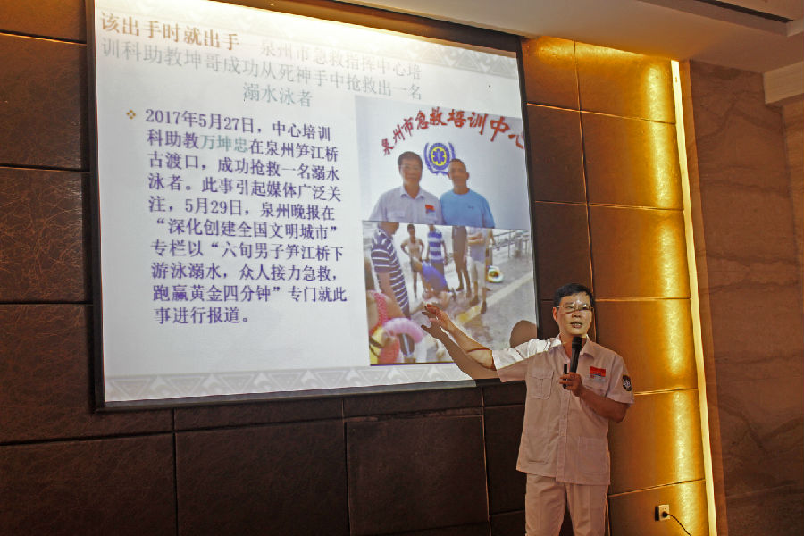 本次培训由泉州市急救中心的陈荣明医生担任主讲,主要介绍了“心肺复苏术(CPR)”的实践操作。据介绍,当一个人呼吸、心跳骤停时,如果能在“黄金4分钟”里得到正确的急救帮助,就能大大提高抢救成功的几率。“心肺复苏术”目的在于重建呼吸和循环,保障重要脏器血氧供应(60秒以上